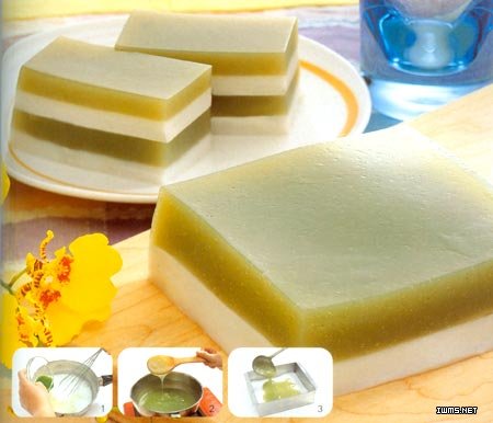 2,將材料(3)中的抹茶粉用少許冷水調拌開來,再與其余材料(3)混合,置于爐子上邊煮邊攪拌,帶沸騰時,快速攪拌至弄抽狀且呈透明色,即可以關火3,待圖一凝結了,就倒入圖二,待凝結,即可以食用,食用時切塊!