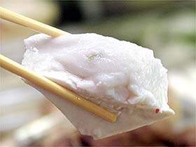 將雞胸肉縱切成絲,用刀背輕輕敲打,撒上精細食鹽和黃酒,放置4-5分鐘。雞蛋打入碗中,加冷水150毫升,調入小麥粉,迅速用力攪勻成蛋糊。雞肉絲蘸上蛋糊,在熱油中炸熟,撈出放在粳米飯上,撒以綠茶末、細鹽及干紫菜絲即成。