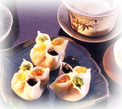 做法:先將胡蘿卜切成小丁,茶葉泡開后切成末;將胡蘿卜丁、茶葉末、青豆、玉米粒用適量鹽、雞精、胡椒粉(根據自己的喜好決定)、蠔油、白糖、麻油調味后拌勻;加入少量面粉、鹽和油和成面團。最后將和好的面搟成薄皮,包入調好的餡,做成餃子,上屜蒸5分鐘左右即成。