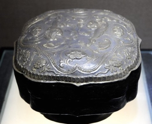盒高12.0厘米,長(zhǎng)17.3厘米,寬16.8厘米。盒體作四出菱弧形,之為直口,直壁,淺腹,平底,喇叭形圈足。鈑金成 型,紋飾鎏金。盒蓋、盒身,上下對(duì)稱(chēng),以子母口扣合。蓋面隆起,鏨有奔獅、西蕃蓮和蔓草。盒蓋、盒身各鏨一圈二方蓮葉蔓草,并以魚(yú)子紋為地。盒底緣鏨一圈蓮瓣紋。它是唐懿宗延慶節(jié)進(jìn)奉用器。