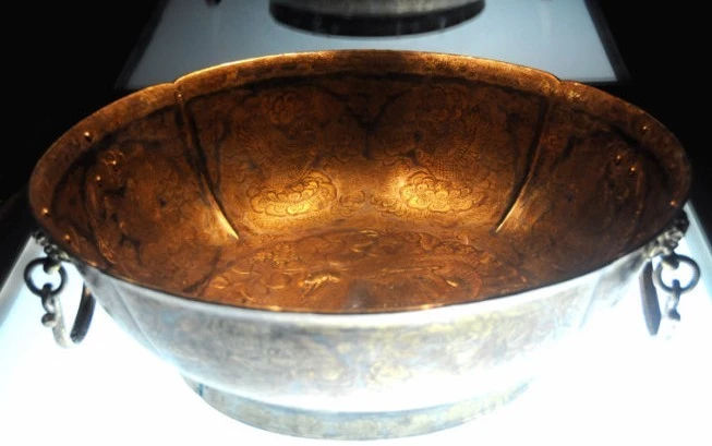 通高14.5厘米,口徑46.0厘米,足徑28.5厘米,足高2.5厘米,壁厚0.6厘米,總重6265厘米。澆鑄成型,紋飾鎏金。盆為葵瓣形侈口,圓唇,斜腹下收,有矮圈足。盆口有一圈蓮瓣紋,盆壁分四瓣,每瓣鏨兩個(gè)石榴團(tuán)花,團(tuán)花中有一只鴛鴦,還襯有流云和闊葉紋。盆腹內(nèi)外,花紋雷同。盆底有一對(duì)嬉戲鴛鴦為中心的石榴團(tuán)花淺浮雕。圈足微外撇,外飾二十四尕蓮花。