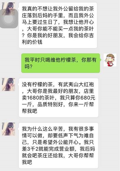 這個時候,騙子十有八九會出現(xiàn)跟你說失戀的情況,哭的傷心欲絕,然后跟你傾訴,讓你憐香惜玉,之后會跑到武夷山爺爺奶奶或者外公外婆家中療傷,幫忙種茶炒茶,學(xué)會炒茶葉后決定自立自強,開創(chuàng)自己的事業(yè) —— 炒茶葉,賣茶葉。