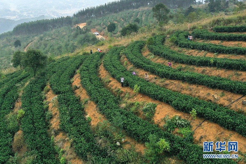 無(wú)人機(jī)航拍農(nóng)戶們?cè)诓枞~種植扶貧示范園給茶樹(shù)除草。 劉君攝