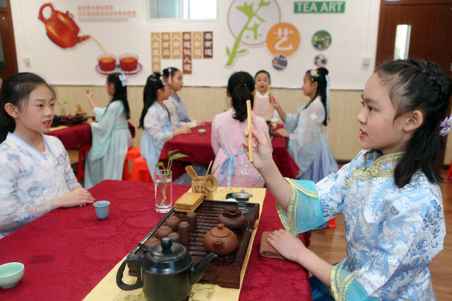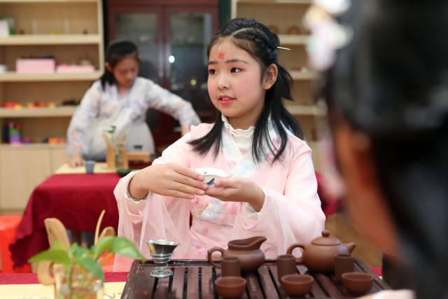 日前,天津市和平區(qū)哈密道小學舉行“以華服之美,致敬茶事之道”校園茶藝展示活動,組織學生們進行茶服和茶藝展示,在校園里弘揚傳統(tǒng)文化。