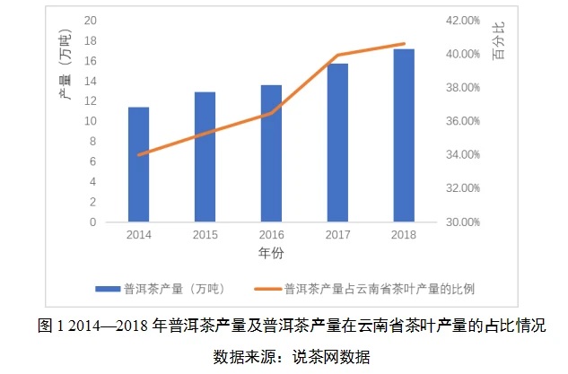 (一)產(chǎn)量持續(xù)增加。近五年來(lái),普洱茶產(chǎn)量呈持續(xù)增加的趨勢(shì),從2014年的11.4萬(wàn)噸增長(zhǎng)到2018年的17.2萬(wàn)噸;普洱茶占比也不斷提高,從2014年的34.0%提高到2018年的40.6%。