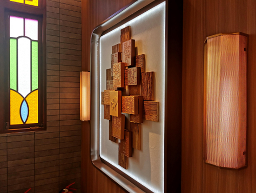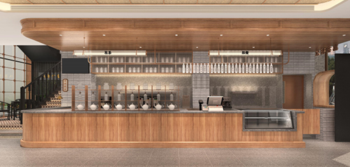 水吧區(qū)域的木紋理與天然石材構(gòu)造傳統(tǒng)茶樓氛圍,以新延舊的方式來設(shè)計(jì)水吧區(qū)域。
